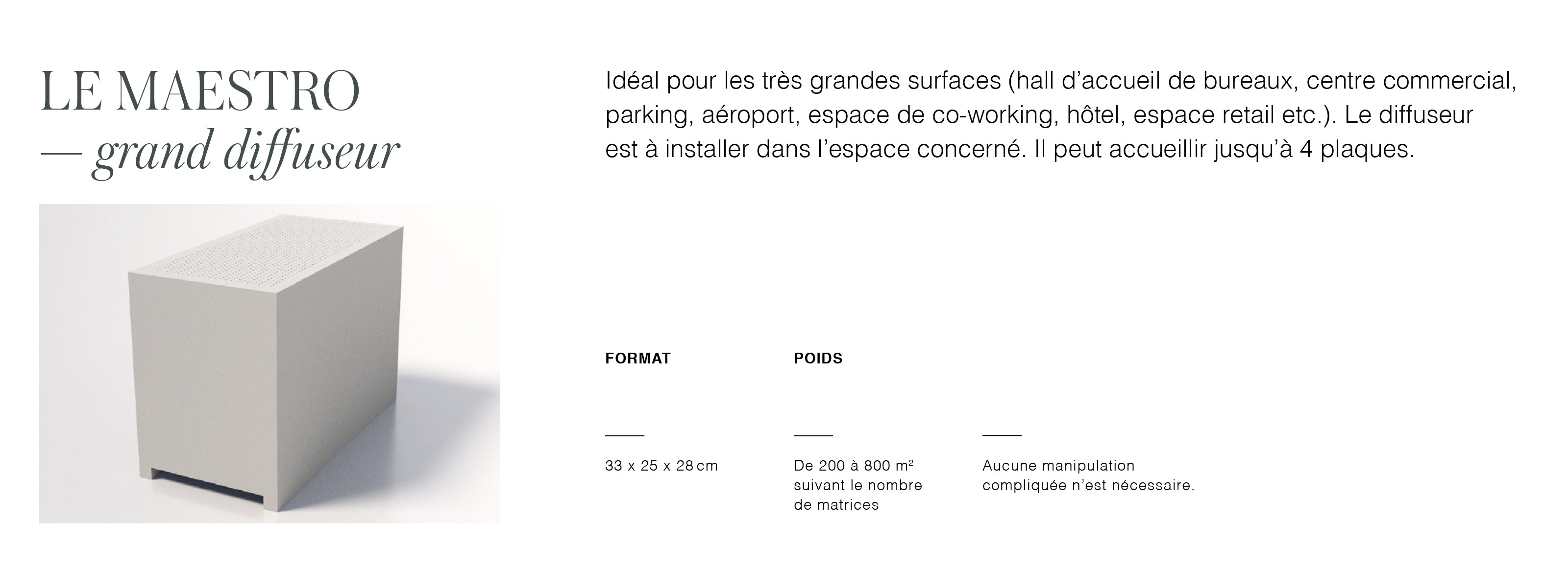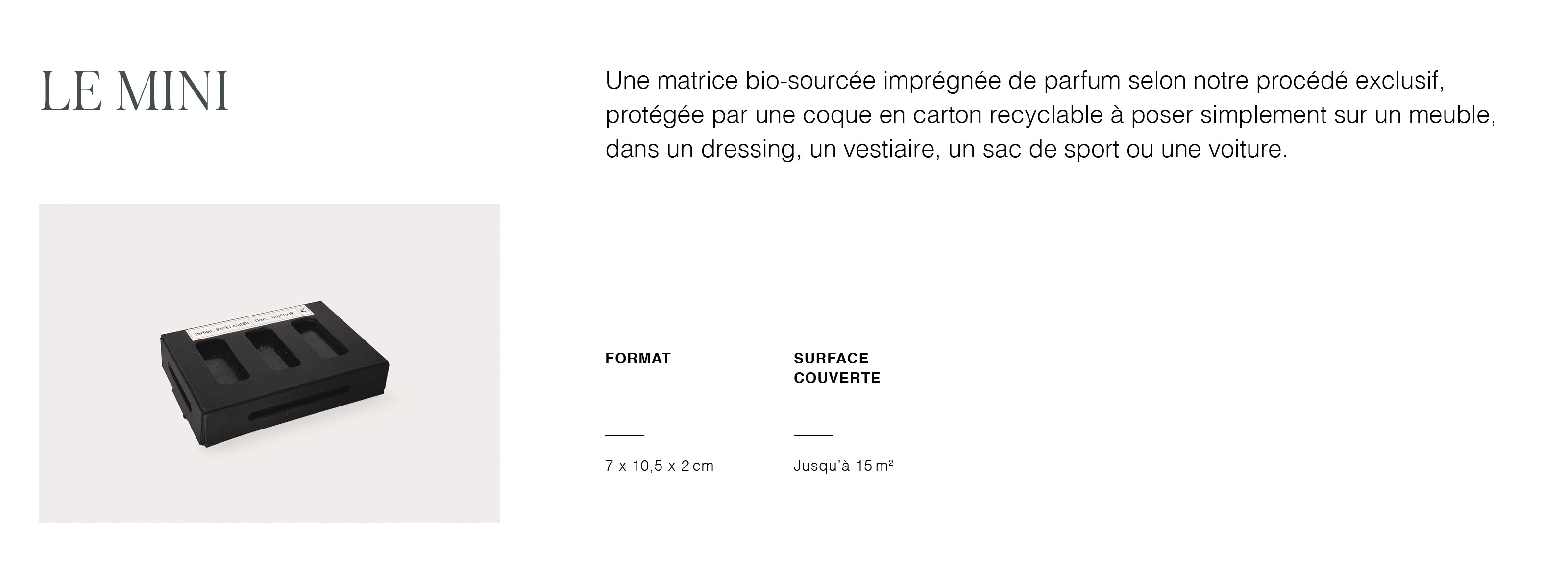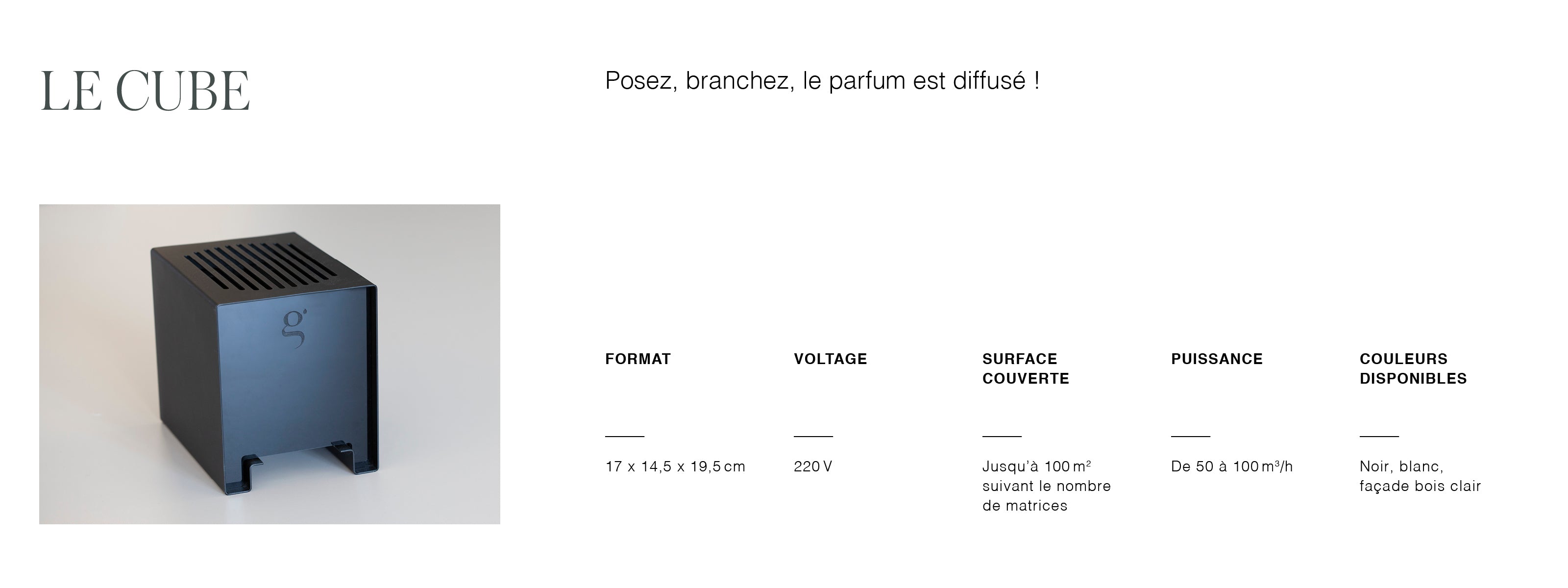 Parce que les petits espaces n’ont pas toujours de système de ventilation intégré (ou bien parce que l’on veut pouvoir diffuser des ambiances olfactives distinctes dans différentes zones), nous avons développé des solutions simples et autonomes. Posez, branchez, c’est diffusé.